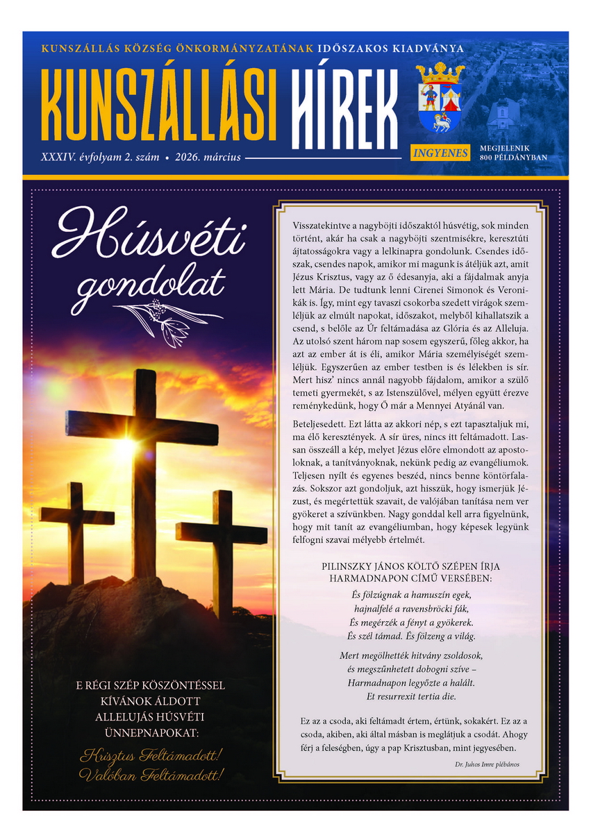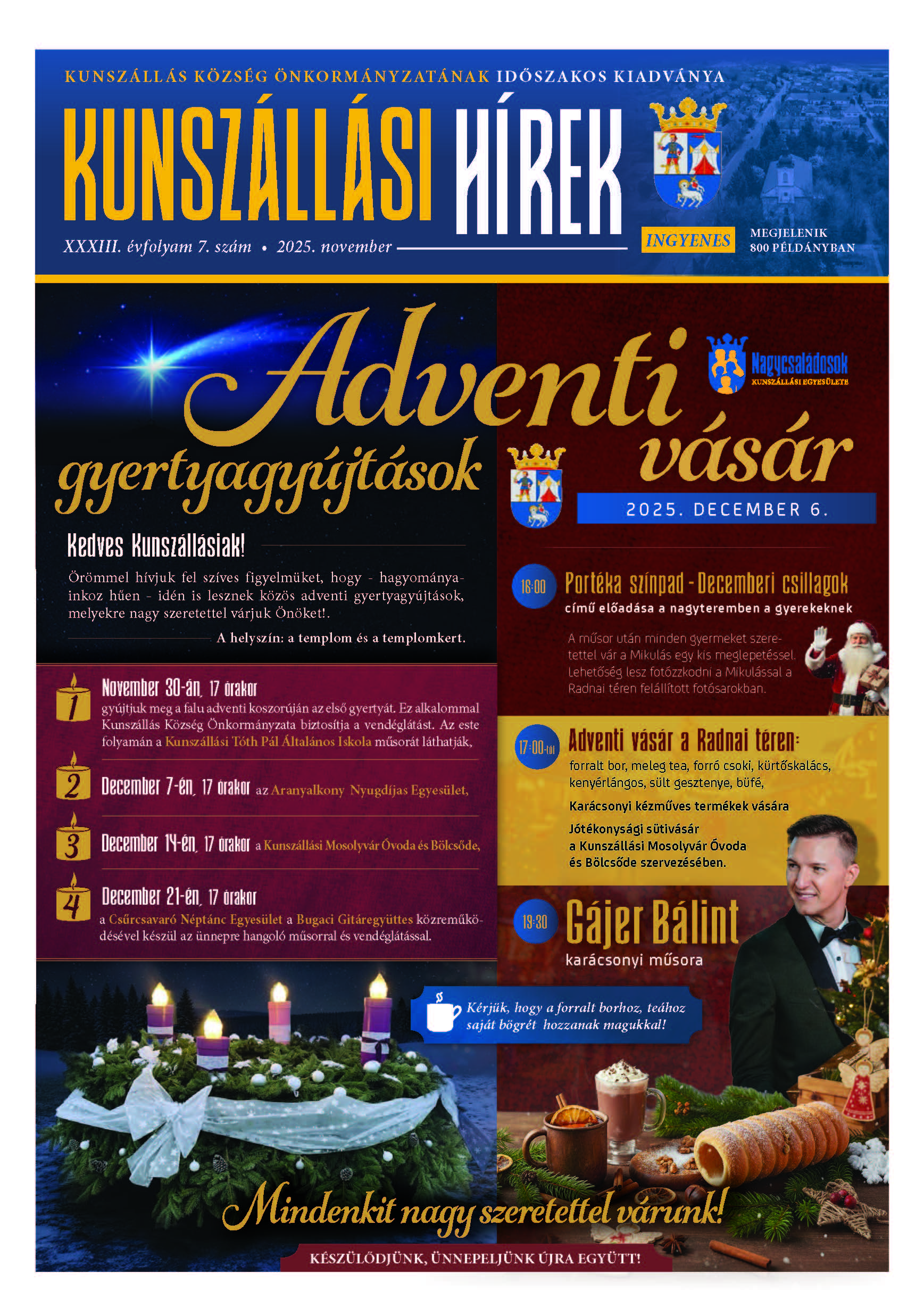 Nagy örömünkre szolgál, hogy egyre több helyi fiatal dönt úgy, hogy szülőfalujában marad és alapít családot, ugyanakkor a környékről és az ország legkülönbözőbb pontjairól is szívesen választják fiatal párok, családok Kunszállást leendő otthonuknak. Ennek a folyamatnak támogatásaként számos beruházás valósulhatott meg az elmúlt években és továbbiakat tervezünk az előttünk álló időszakban. Nap, mint nap azért dolgozunk, hogy Kunszállás még élhetőbb, színesebb és családcentrikusabb település legyen. Célunk a honlap megújításával, hogy segítséget nyújtsunk az itt élők mindennapi ügyintézéséhez, ezért a felületen folyamatosan megtalálható lesz minden fontosabb tudnivaló és friss információ.