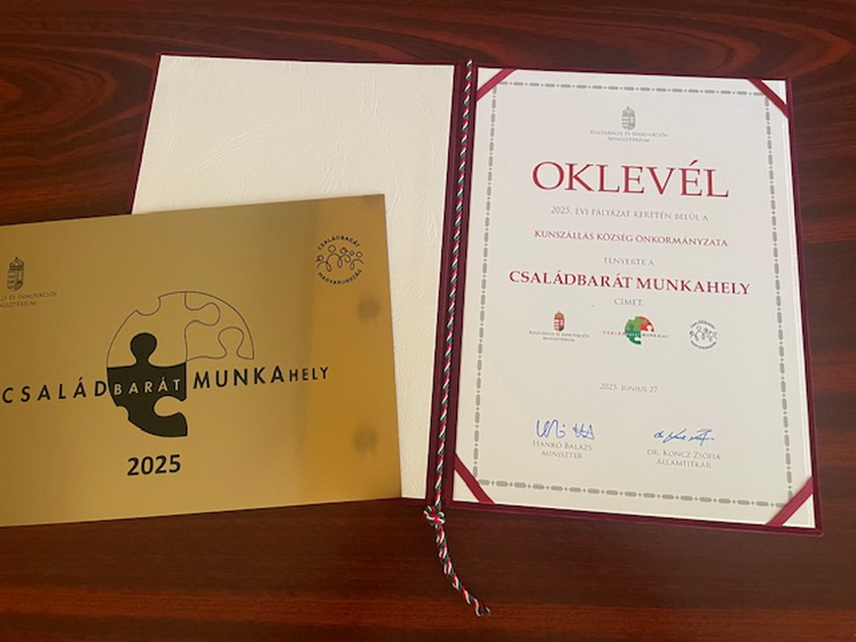Kunszállás Község Önkormányzata elnyerte a megtisztelő „Családbarát munkahely” címet