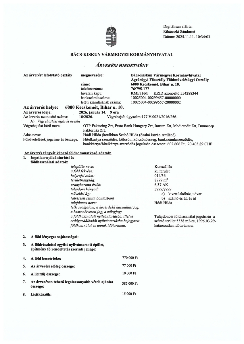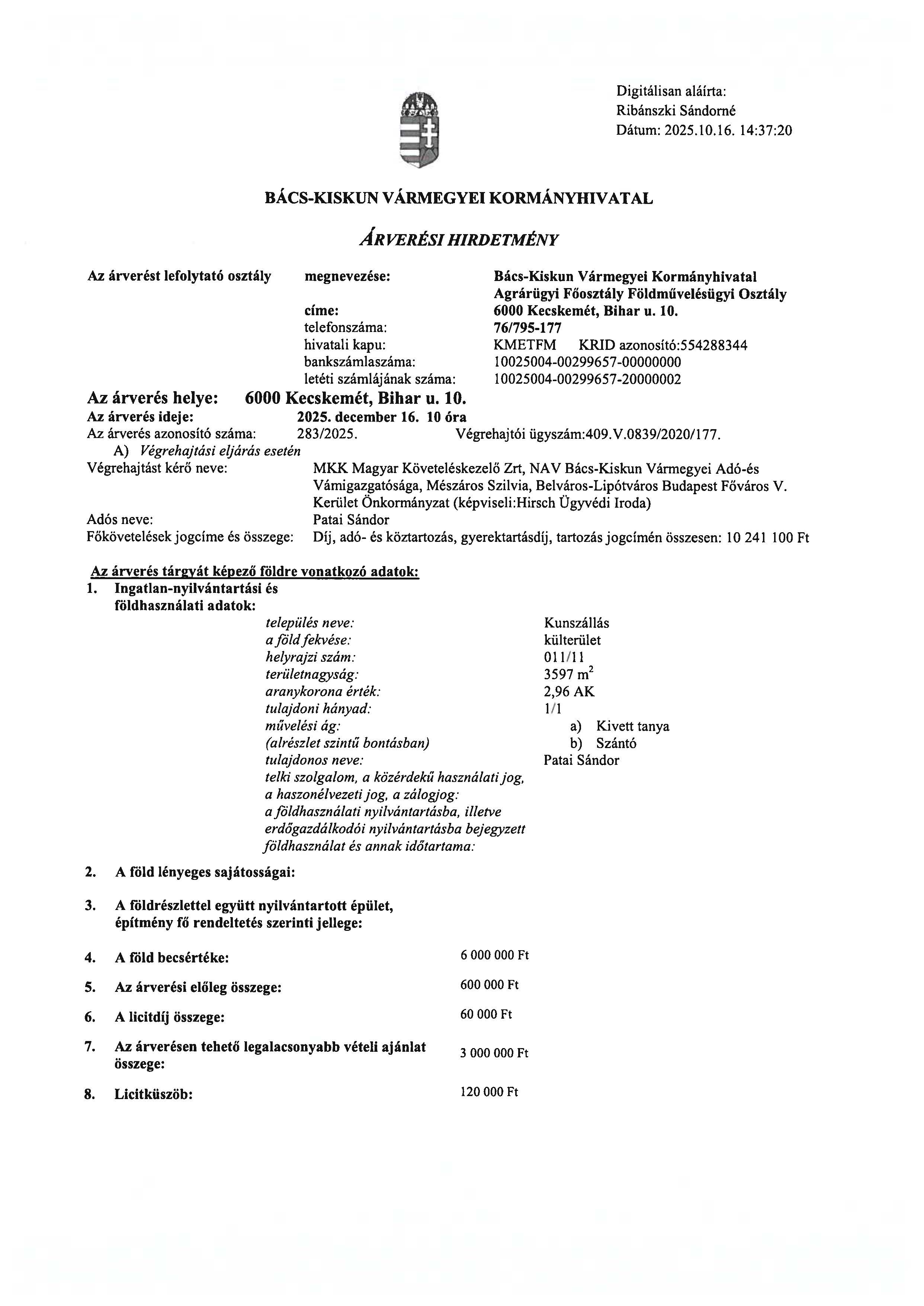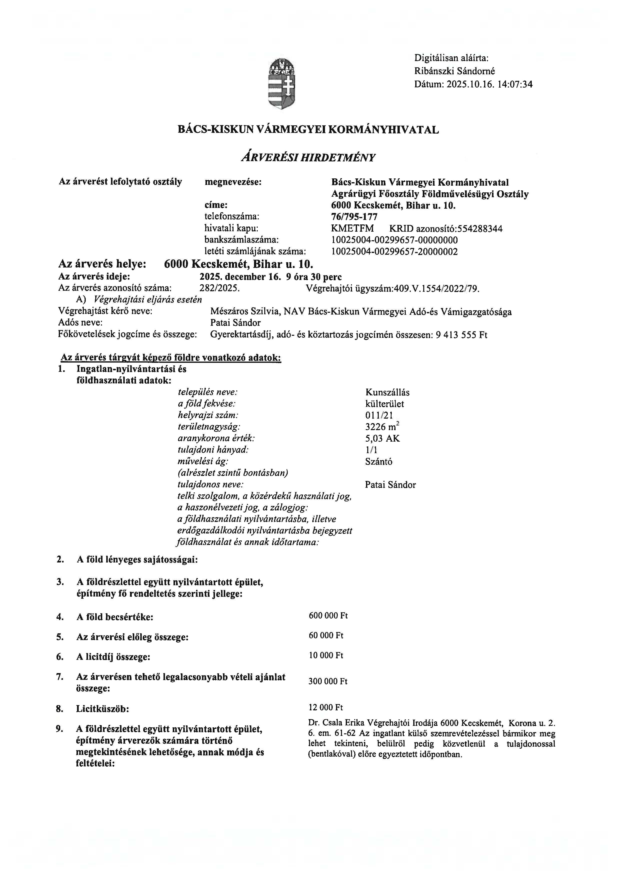 BÁCS-KISKUN VÁRMEGYEI KORMÁNYHIVATAL hirdetménye