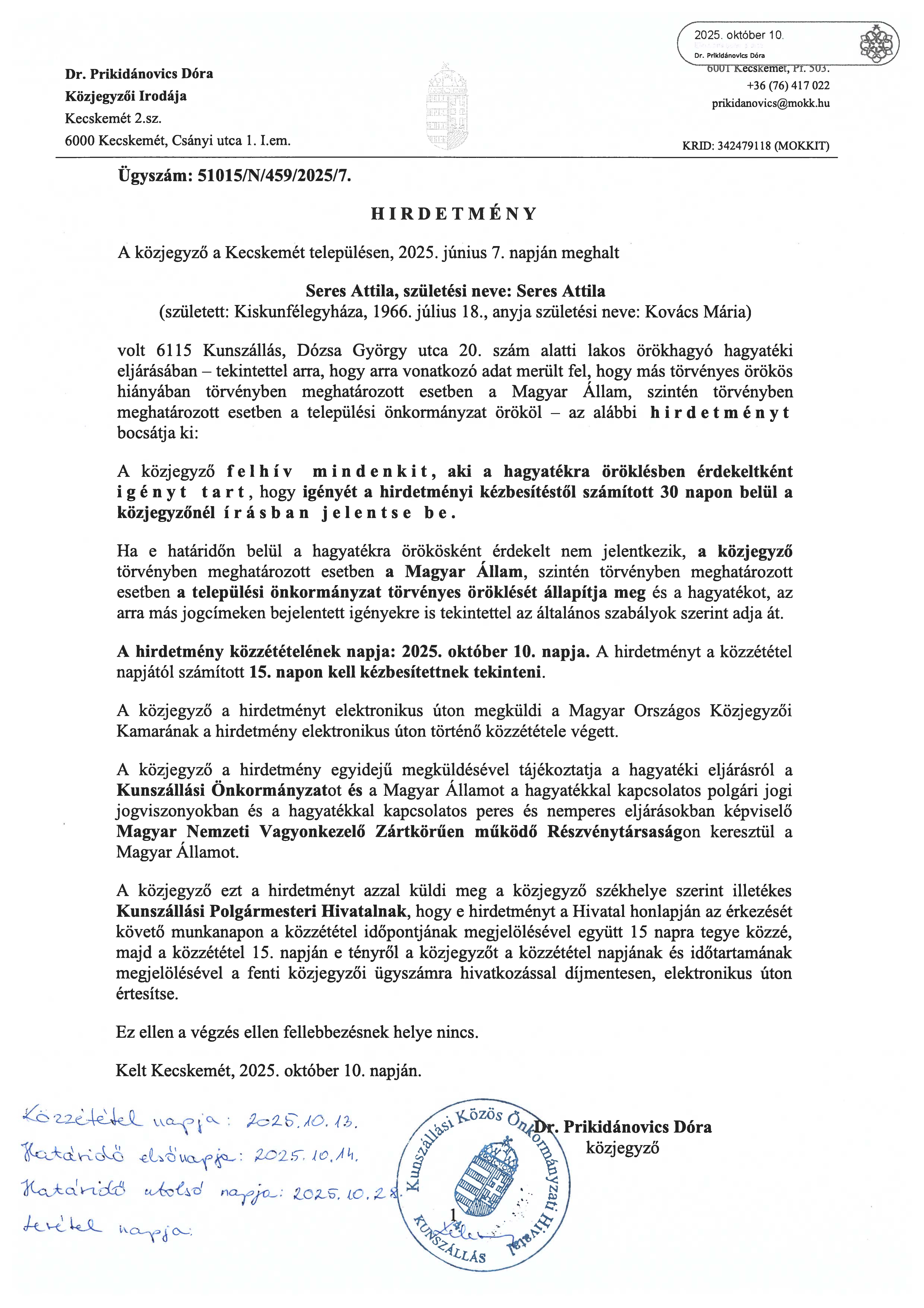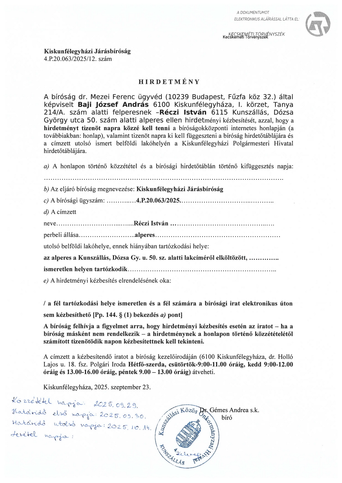 Kiskunfélegyházi Járásbíróság hirdetménye