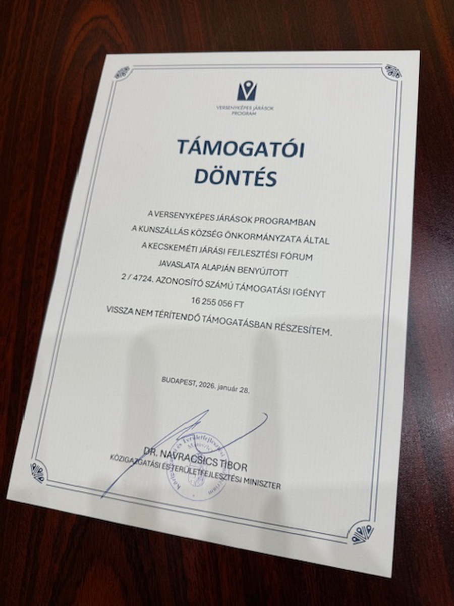 Örömmel jelenthetjük be, hogy a Versenyképes Járások Programnak köszönhetően újabb sikeres pályázattal gyarapodtunk. Kecskeméten, 2026. február 10-én megrendezésre került Önkormányzati Fórum keretében Dr. Dukai Miklós önkormányzatokért felelős államtitkár úrtól vehettem át a 16,25 millió forint támogatásról szóló döntést. Ebből az összegből a Hunyadi utca felújítása fog megvalósulni, a Kossuth utca és a Rózsa utca közötti szakaszon.